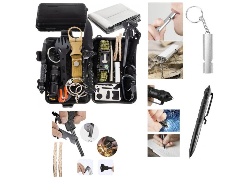 32-dielny set na prežitie v plastovej krabičke s veľkosťou 10x14 cm, ktorý obsahuje množstvo potrebných doplnkov na prežitie ako sú nôž, svietidlo, lanková píla, karabíny, kresadlo, príbor, teleskopická tyč na dúchanie ohňa a mnohé ďalšie.