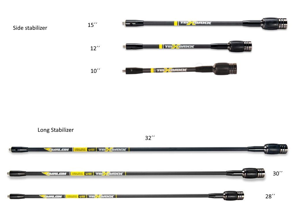 Avalon stabilizátor TEC MAXX 13 mm hi-modulus carbon a extra pevný 48-ton karbón s gumovými tlmičmi a závažím na súťaženie, vietor má malý vplyv pri streľbe vzhľadom na svoje úzke telo. Závažie je niklové tmavošedé.