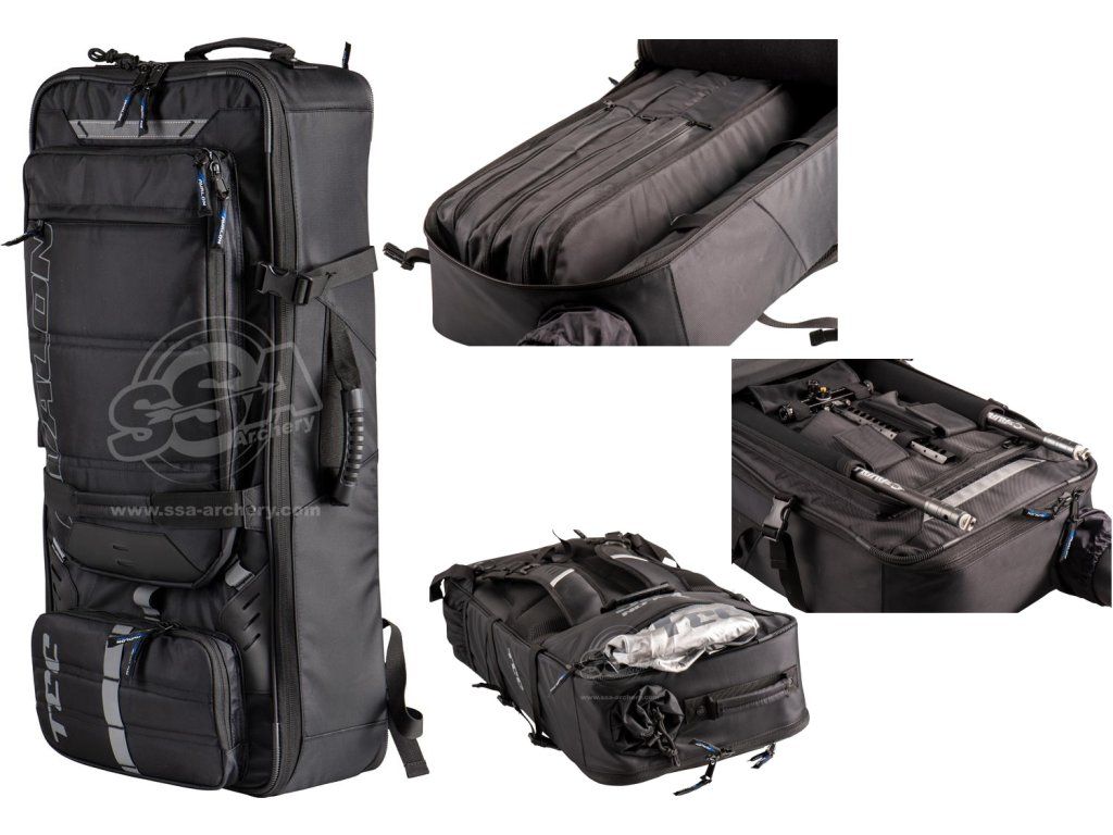 New, enhanced PRO AVALON TEC Backpack for folding Olympic bows with a sleeve for arrows and 3 main detachable pockets for the center and shoulder in black and many other inner and outer pockets. The sleeve and rain cover are part of the set.