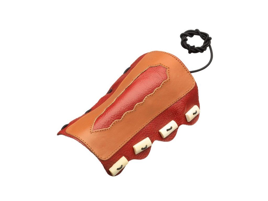 Tradičný kožený chránič s červeným vzorom a kosťovými úchytmi s bokmi a stredovým vzorom do červena. Ľahké upínanie pomocou gumky a 4 kosťových úchytov.