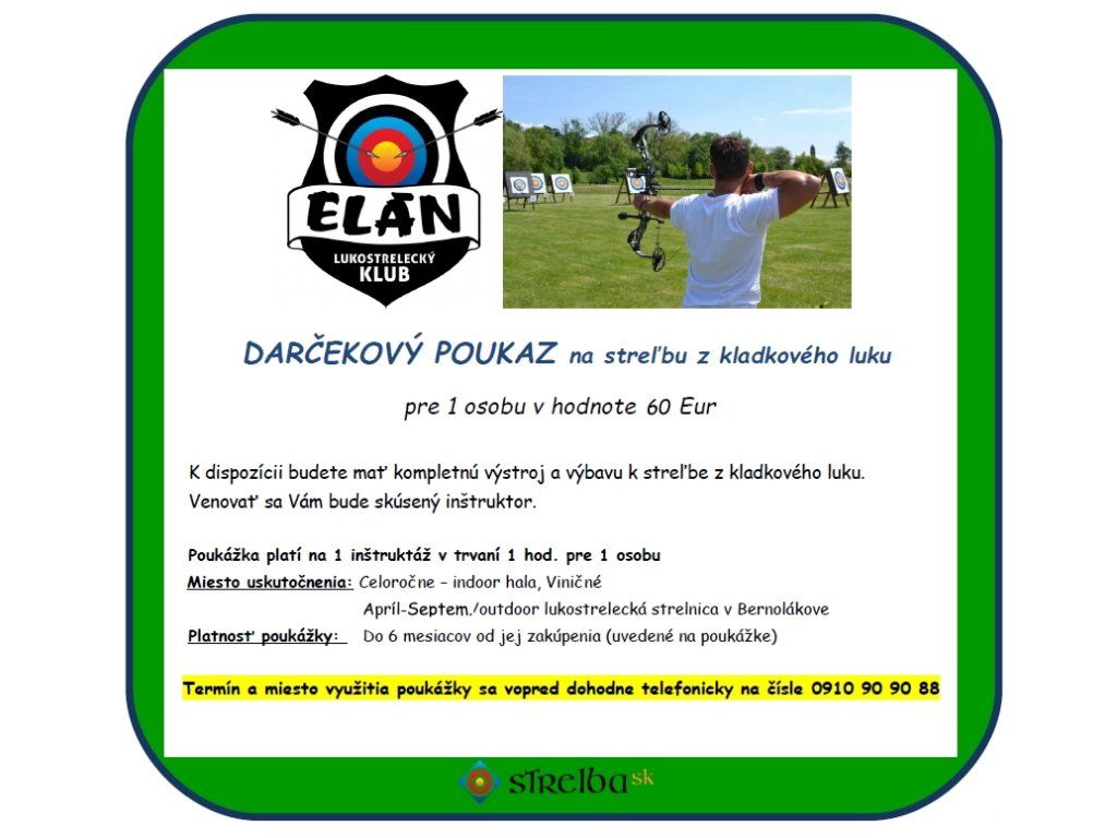 Pred využitím každého poukazu je potrebné dohodnúť sa na termíne, kedy má byť realizovaný, dostatočne pred uplynutím doby platnosti poukazu. Využitie poukazu je možné len v termínoch, ktoré určí poskytovateľ služby, čo je predmetom dohody medzi záujemcom a poskytovateľom služby (Lukostrelecký klub ELÁN). Po uplynutí doby platnosti preukazu záujemca nemá nárok na využitie darčekového poukazu ani na vrátenie peňazí.