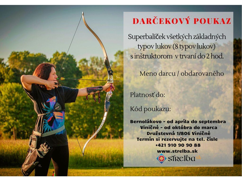 Záujemcom o jednorazový kurz lukostreľby v trvaní do 2 hodín ponúkame možnosť obdarovať svojho blízkeho darčekovým poukazom. Ďarčekový poukaz je vystavený na meno a je prenosný na iné osoby len v prípade, že objednávateľ poukazu písomne požiada poskytovateľa služby (Lukostrelecký klub ELÁN) o zmenu obdarovaného pred uplynutím doby platnosti poukazu.