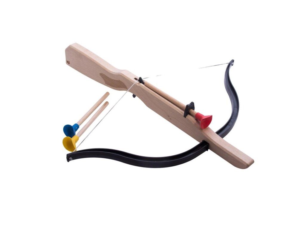 Detská drevená kuša - hračka na prísavkové šípky, bezpečné šípky, ktoré pri výstrele na krátku vzdialenosť nepoškodia zrak, ani keď zasiahnu oko. Na konci šípky je gumová plochá prísavka, ktorá rozkladá energiu. Ku kuši sú k dispozícii 3 šípok.