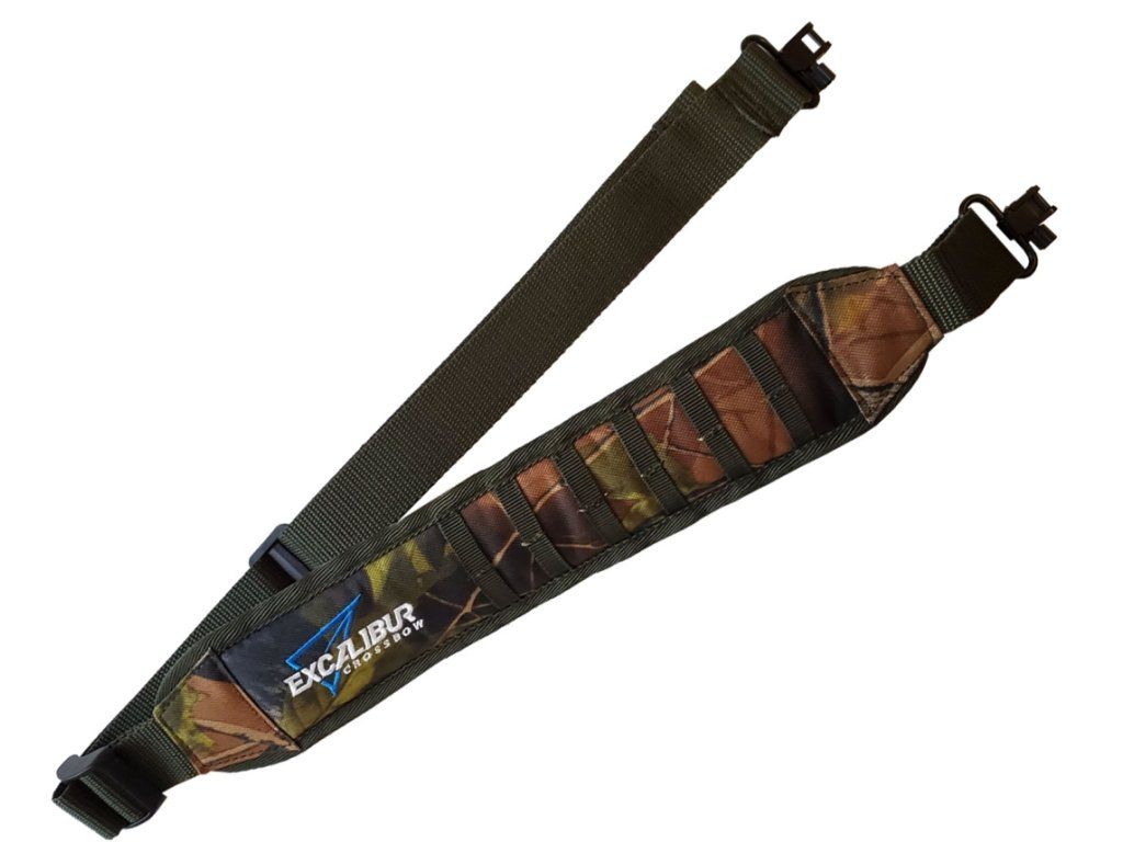 Kvalitný značkový popruh Excalibur ex sling vhodný na akékoľvek kuše na nosenie so zápínacími prackami na každom konci (tie sa ľahko namontujú na pripravené šróby, ktoré sú vo väčšine kvalitných kuší) v maskáčovej farbe, ktorú excalibur opäť zaradil do ponuky viacročnej prestávke. Popruh na nosenie na rameno originál od excalibur je kvalitný a pevný popruh, ktorú pasuje ma väčšinu kuší v ponuke.