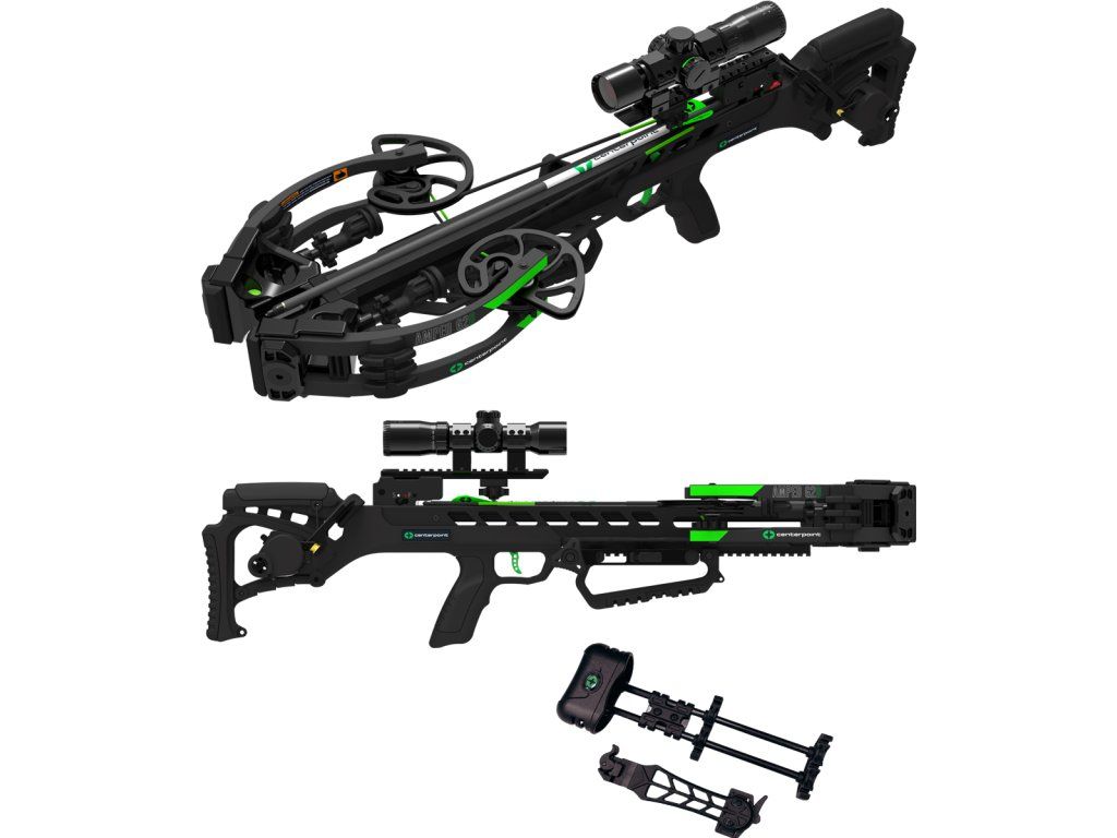 The Centerpoint Amped G2D Compound Crossbow: This high-speed crossbow is ideal for hunting and target shooting with a slim profile of just 31 cm in extended length. Due to its very favorable price, it comes with various accessories such as bow rests, arrow cushions, and nock cushions, making it a truly quiet tactical crossbow with a crank-drive trigger system built into the handle, a front grip through which fingers can be placed and firmly grasped, and a robust trigger. This compact and powerful crossbow is ideal for hunting and target shooting. It comes with a 4x32 illuminated optics, a paralenyl holder for arrows, 3 carbon arrows, a cable-drawn trigger device (eliminating 50% of the trigger pull force), a deadshot system, a rubber grip on the handle, and a lubricant for the rail. After installing special inserts, additional accessories such as a laser, spotlights, and a longer front grip are possible.