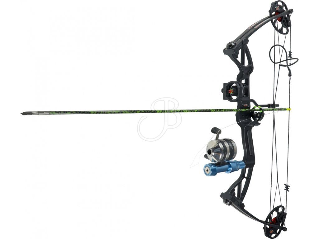 Kladkový lovecký luk 40 lbs so základkou, loveckými šípami s harpúnovým hrotom, držiakom na šípy, lankom a navijákom na lov aj väčších rýb vo farbe ako na obrázku FIREFOX BOWFISHING KIT . Táto forma lovu u nás nie je povolená, no sú krajiny, kde povolená je.