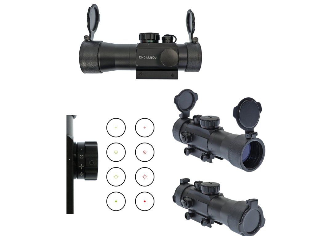 Collimator = optical sight on scopes 2 x 40 with red/green illumination in five illumination intensities with 4 different aiming blades as seen in the enlarged image.
