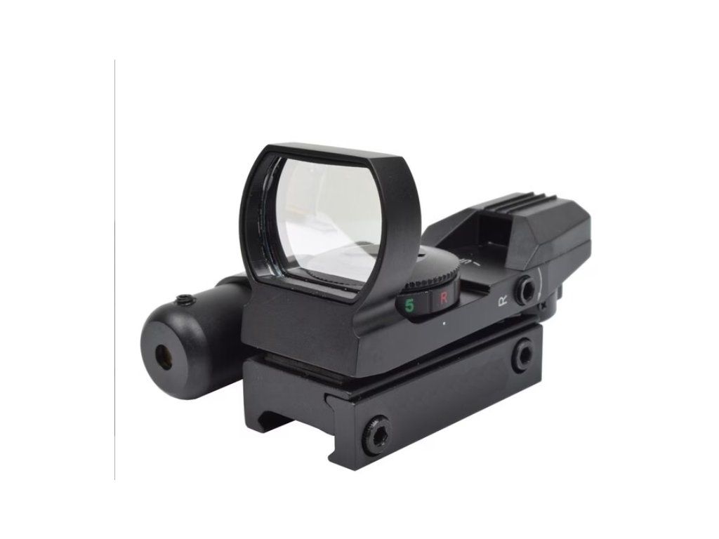 A red dot sight with laser on both hunting and sporting rifles with a laser. The sight has a dual-color spectrum (red and green spectrum) with a multirail (adjustment for 4 different types of crosshairs, i.e., aiming points). The laser has a range of approximately 40m in good dark conditions.