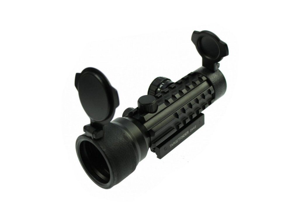 Jednobodový kolimátor s bočnými taktickými lištami na mierenie na kuši a vzduchovke s 2x násobným zväčšením a podsvietenou muškou voliteľnou medzi zeleným a červeným spektrom s ochrannými krytkami. Veľkosť koľajnice je buď weaver / picatinny alebo aj na 11 mm ištu ( stačí len prehodiť montáž). Pasuje na rekreačné kuše alebo vzduchovky. Na taktické lišty picatinny je možné dať rôzne ďalšie doplnky ako laser, vodováhu, svetlo a pod.
