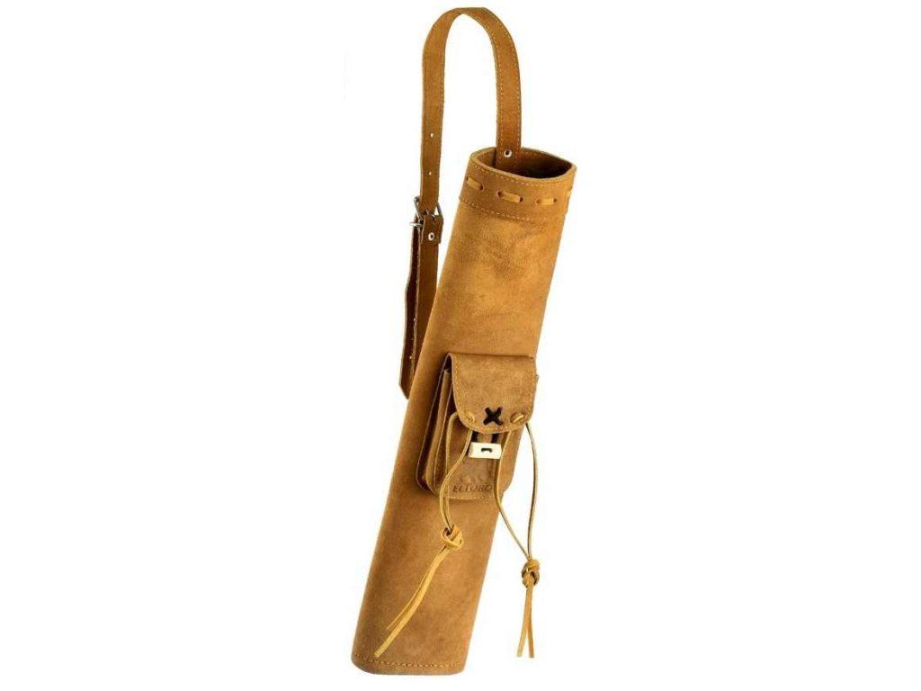 Kožený tulec na šípy na chrbát z ekokože v svetlej hnedej farbe s odkladacím vreckom (zapínanie na gumičku o kostený úchyt) a nastaviteľným popruhom. Popruh nie je odnímateľný.