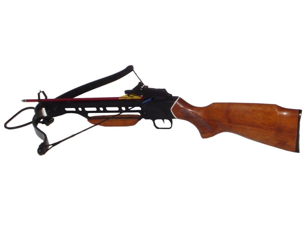 Rekreačná kuša Python 150 o sile 150 lbs s drevenou pažbou v sete (s klasickým otvoreným mieridlom s priehľadom vzadu a muškou vpredu a dvoma hobby šípmi) na rekreačnú terčovú streľbu do 20-30 metrov. Kuša má jednoduché mieridlo, aké sa používa na vzduchovkách, je nastaviteľné stranovo aj výškovo. Na kušu je možné v budúcnosti namontovať aj optiku. súčasťou kuše sú 2 duralové šípy do kuše. Materiál je dostatočne pevný na roky používania. Kušu strelec nikdy nesmie púšťať naprázdno bez založeného šípu ! Na kušu je možné pripevniť popruh na lepší prenos kuše. Koncovky ramien kuše sú z plastu a dajú sa dokúpiť po ich zničení. (4 Eur /pár)Súčasťou je samoistiaci mechanizmus proti náhodnému vystreleniu, ktorý je treba pred výstrelom odistiť. Vpredu je nášľap, ktorý slúži na pohodlné zapretie kuše nohou pri jej naťahovaní.