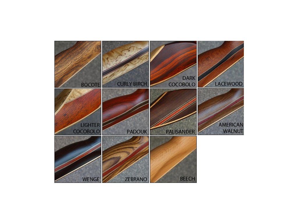 Všetky modely lukov FALCO od Falco spirit (aj Myth, Force, Trophy, Storm, Storm 2, Trophy vintage, ) je možné objednať v rôznych variantoch použitého dreva na objednávku.