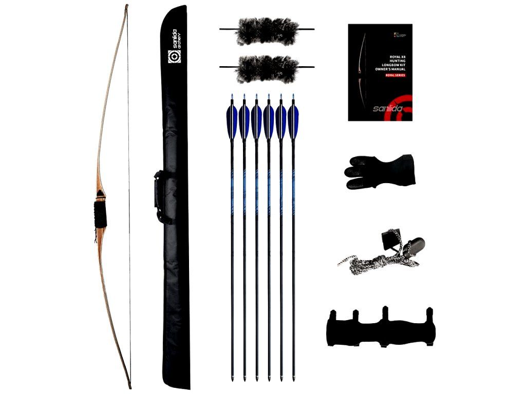 Longbow Sanlida s hnedou štruktúrou a čiernymi ramenami so štandardnou dlžkou 68´´a jemným reflexom vo veľmi výhodnom sete luku, 6 šípov, chrániču prstov- rukavica, chránič paže, tlmič hluku tetivy, taška na luk a naťahovač tetivy. Vhodný ako rekreačný luk ale aj na začiatky súťaženia. Pomerne príjemný mäkký náťah, vysoká pružnosť aj pevnosť. Svetlý drevený dekor. Cena s tetivou.