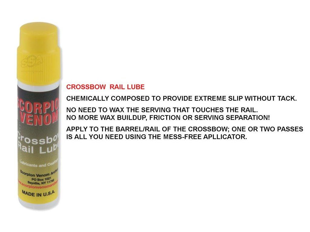 Lubrikant na koľajnice kuší SKORPION VENOM, ktorý znižuje lepivosť ochranného vosku na koľajnicu, znižuje spomalenie šípu a tým spresňuje streľbu.