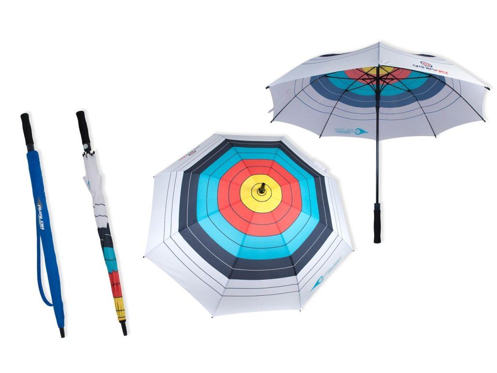 Dizajnový veľký dáždnik/slnečník na súťaže vo farbách terča určený aj na bežné nosenie v nepriaznivom počasí. FIVICS umbrella buď ako farebný terč (na obrázku) alebo čierno - žltý field archery umbrella AVALON (ďalší produkt) je v cene 18,90 Eur