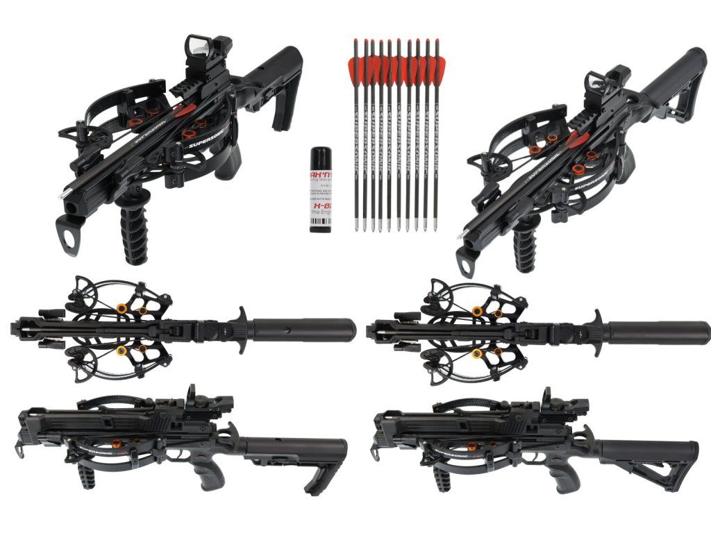 Veľmi rýchla a pritom malá kuša Supersonic REV na športovú streľbu s efektívnym využitím napínacej sily a až 420 fps rýchlosť šípu (pri ľahkých šípoch). Napína sa pomocou tiahla vzadu, dospelý človek ju rukou jednoducho natiahne. Súčasťou je nastaviteľný kolimátor so 4 možnosťami zámerných krížov v dvoch farbách zelenej a červenej, teleskopická pažba, dorazy tetív, predná sklopná rúčka a 10 karbónových šípov. Efektívny dostrel cca do 50-60 metrov.