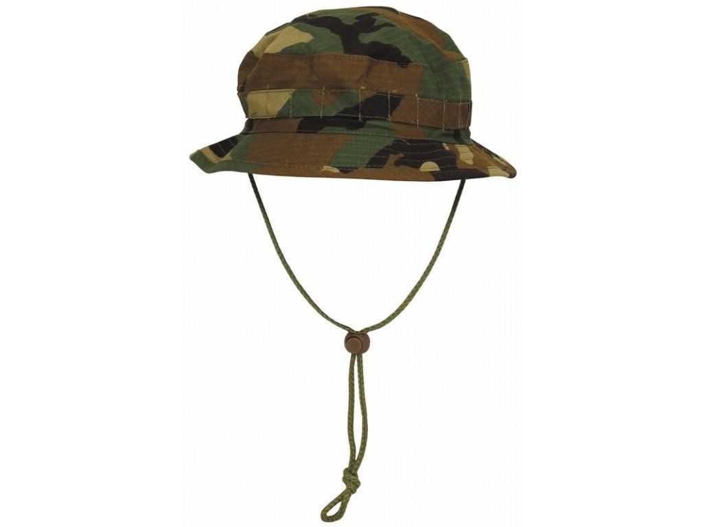 Klobúk v maskáči woodland camo, ktoré nosia britské špec. jednotky. Rip stop je pletenie, ktoré sa nepára ďalej pri roztrhaní jednej časti.