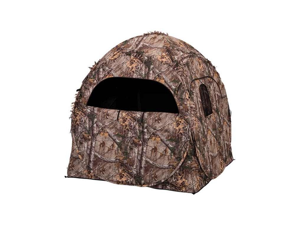 Smaller branded hunting blind Ameristep doghouse blind for hunting with a bow or arrow or shotgun from the ground. Excellent camouflage, designed for professional hunters. Easy assembly and disassembly. When shooting with a bow, you need to shoot in a crouch, due to the height of the blind. The Ameristep doghouse hunting blind is designed for hunters hunting game with a bow or other weapons has multiple shooting options, good camouflage and ventilation. It can be unfolded in a couple of seconds, a special construction, opens like a parasol and is also quickly folded. Just as quickly assembled and a compact size for transport. Hunting blind for hunters with a bow, camouflage blind for transport and an excellent hunting hide. Available Ameristep doghouse camouflage blind for hunters preferring to shoot from the ground. The Ameristep doghouse cover is included with 3D sheets, realtree xtra camo.