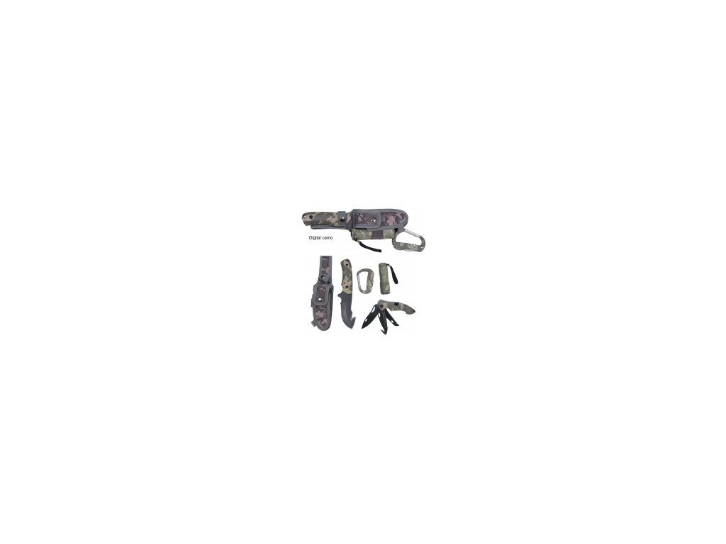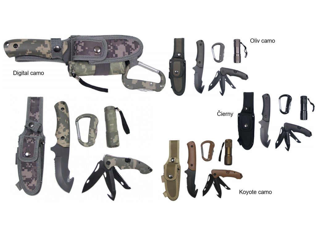 MFH set dýkového noža, svietidla 9 LED (na 3AAA batérie - nie sú súčasťou), karabíny a skladacieho noža s viacerými funkciami AT-digital ako dobrá hobby výbava pre outdoor využitie alebo ako dobrý darček pre deti aj dospelých.