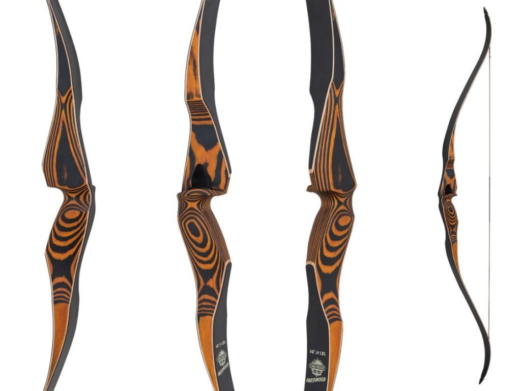Hunting bow made from a single piece of Oak Ridge Hardwood with an interesting laminated design featuring orange laminate, suitable for traditional archers with a 62 draw length, also suitable for longer draws up to 30. Laminated limbs, a thicker grip suitable for men. Includes a Flemish twist string and a bow backing. Black ash limbs with black laminate.