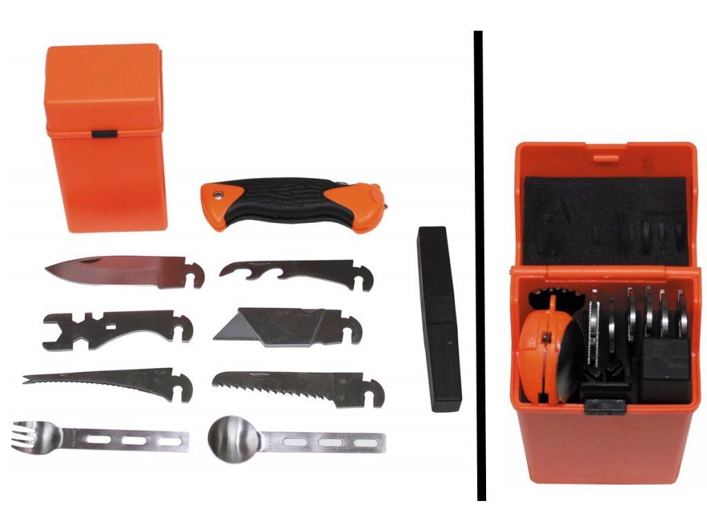 Outdoor hobby set na prežitie 27 častí pre rôzne použitie pri kempovaní a v prírode, súčasťou je nôž, ostatné diely sú kompatibilné a vymieäajú sa na jednu rúčku.