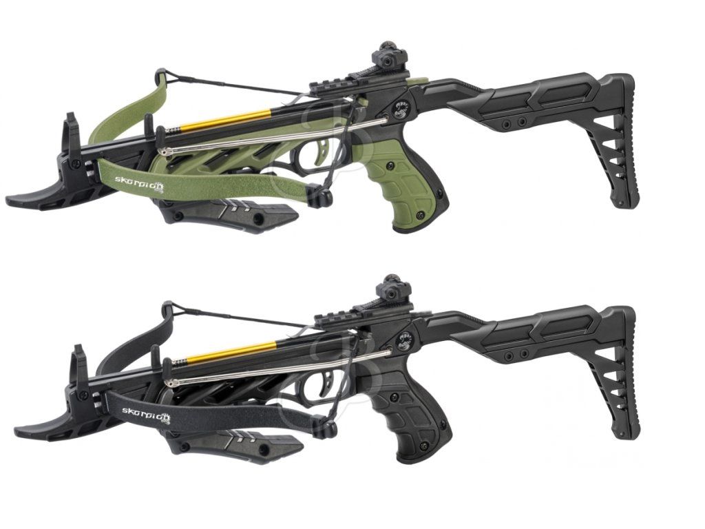Pistol crossbow ALLIGATOR 2 / Skorpion PXB 100 / Man kung alligator 80 lbs with a limb made of hard composite material. Good and quality pistol crossbow, the BEAR DESIRE XL American crossbow similar to hobby shooting is the force actually 60 pounds per shot to 10-25 meters with a pistol handle. The Skorpion PXB 100 crossbow has a simple adjustable sight to 4 sides and a rear limb.