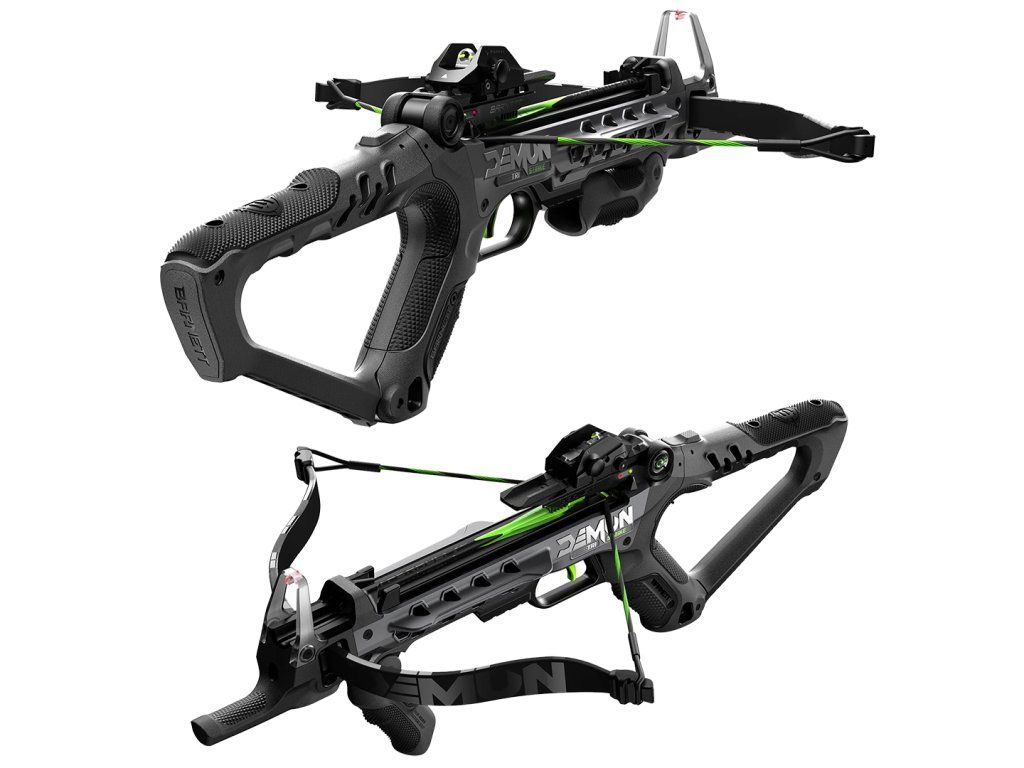 Nová pištolová kuša Barnett DEMUN TRI STRIKE COMPACT je novinkou od Barnett kombinuje versatilitu, kompaktnosť, disponuje trojšípkovým zásobníkom pre rýchlu streľbu. Set obsahuje 5 7 palcových šípov HyperBolt 2F mini. Mäkký gumový dizajn umožňuje ľahké naťahovanie. Na mierenie sa používa priehľadové mieridlo s muškou nastaviteľný všetkými smermi. Sklopiteľné predné držadlo.