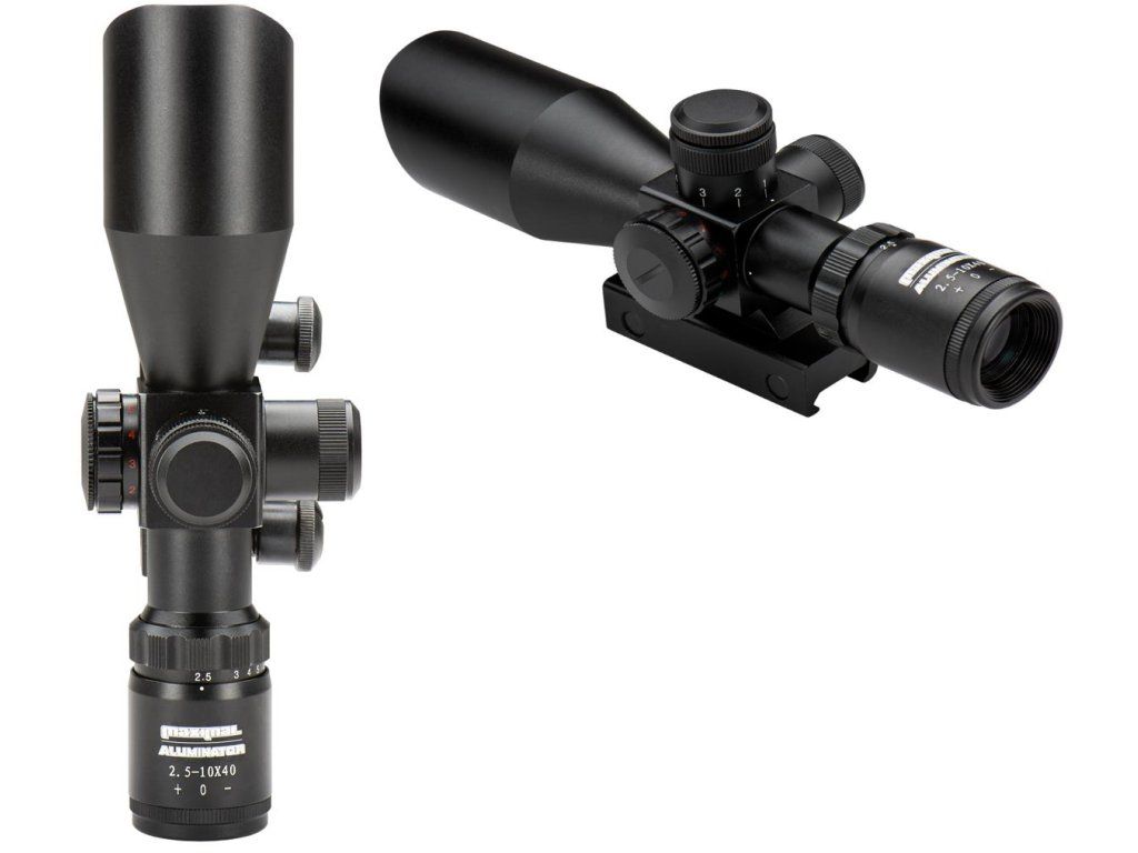 Excellent optics for rifles Maximal Aluminator with additional illumination from a fixed base in green or black the crosshair and variable 2 to 10x magnification ideal economical and quality optics for rifles shooting up to 100m. Part of the package also include cheek pads with mounting on rifle / pistol and front shield. Suitable optics for target and hunting shooting.Please: for weaver and picatinny
