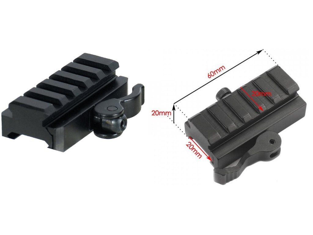 Rýchloupínacia weaver zvyšovacia montáž na kolimátory, keď strelec potrebuje zvýšiť kolimátor, aby mal komfortný pohľad do kolimátoru a nemusel sa prikrčovať. Vrchná lišta je tiež weaver. Na väčšom obrázku sú rozmery. Rýchloupínanie umožní bez kľúčov a imbusákov nasadiť a zosadiť montáž aj s kolimátom z kuše.