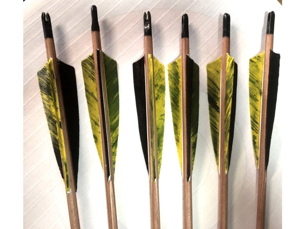 Šíp s prírodnými letkami na tradičnú streľbu, tyčka je maľovaná na čierno. Konček je zárezový, letky sú 4´´ shield, hrot field plechový, šíp je omotaný na letkách vláknom