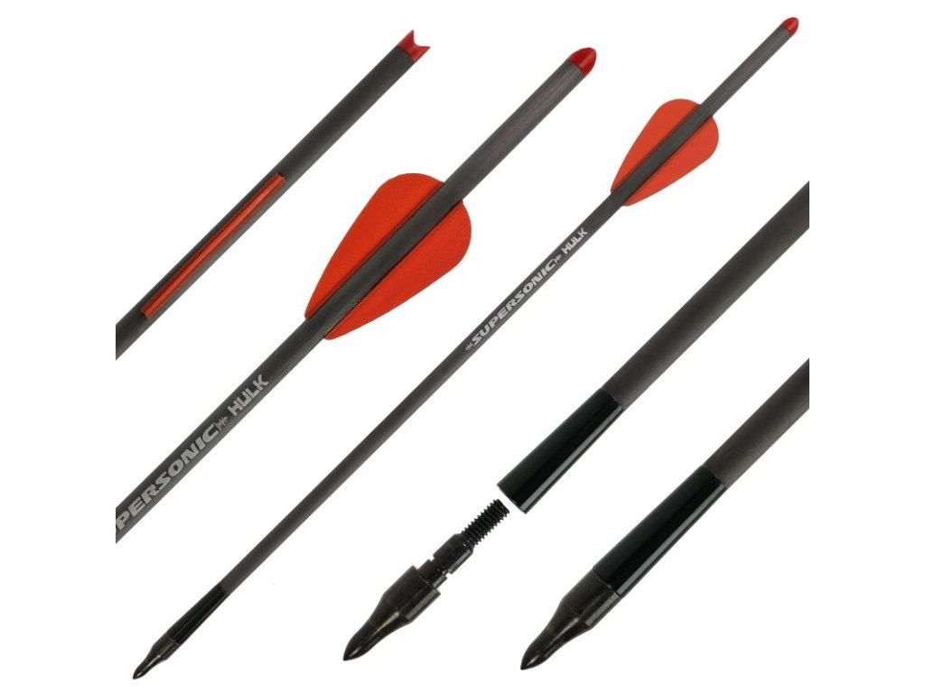 Šípy do pištoľových kuší karbón značky SUPERSONIC hulk s priemerom len 0,6 mm osadené ťažkým aj pomalejším hrotom a celý šíp vážiaci 250 gn. Na šípoch sú dve letky oproti seba a insert do ktorého môžete dať rôzne lovecké hroty, v základe je 100gn šróbovací oceľový hrot. Vhodný do pištoľových kuší z našej ponuky a najma REV, Supersonic a Drakon.
