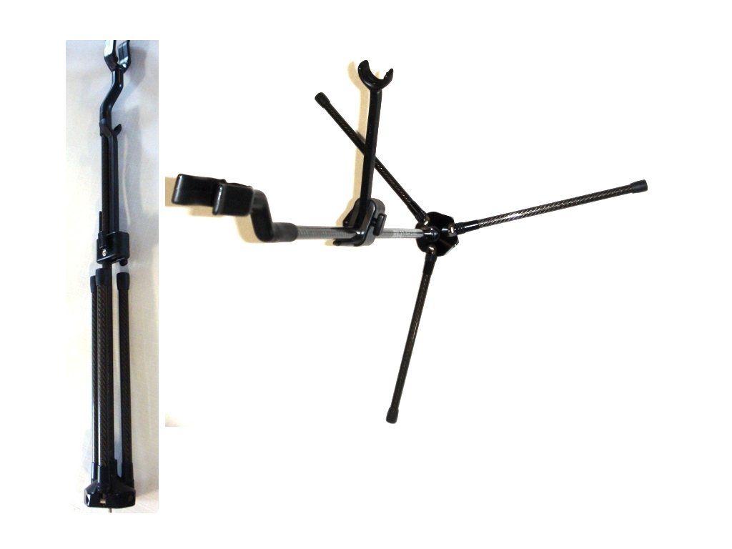 A high-quality carbon magnetic quiver stand for comfortable storage of the bow immediately after shooting arrows for advanced archers. The legs of the stand can be unscrewed and spread out. The bow stands leaning against a stabilizer. All competition archers use these stands. Cartel Midas RX-10 bowstand.