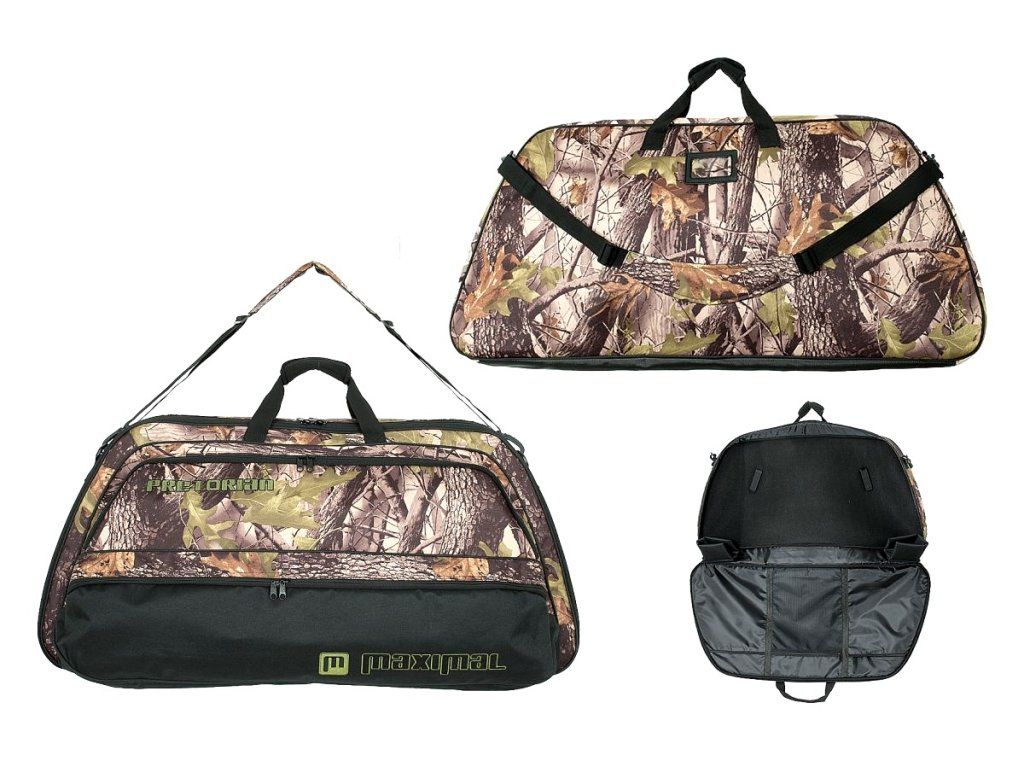 Taška Maximal Pretorian na kladkové luky s maskáčovým vzorom, troma vnútornými vreckami a popruhom na nosenie, vypolstrovaná.