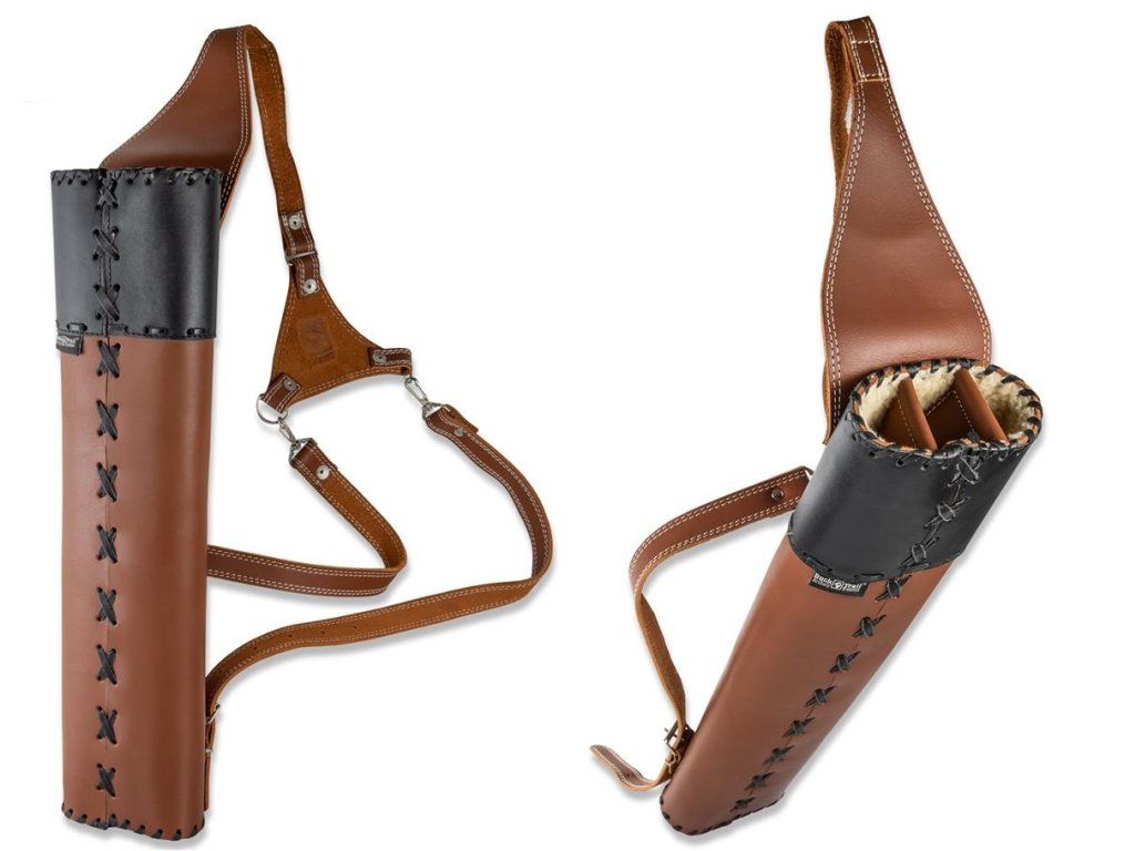 Tradičný chrbtový tulec Buck trail Husky z hnedej kože a oddeľovačom šípov a vystlaný vlnou, šípy tak neklepú o strany tulca.