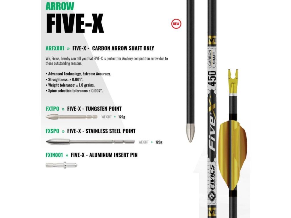 Novinka od japonskej firmy Fivics, ktorá dodáva kvalitné lukostrelecké produkty už dlho, šíp Fivics five X je tenkostenný karbónový šíp s mc 46 tonovým karbónom. Skvelá voľba pre súťažných ambicióznych strelcov na terčovú streľbu, výrobca deklaruje najlepší sústrel šípov. Súčasťou je pinový adaptér. Top šíp na reflexné aj kladkové terčové luky.