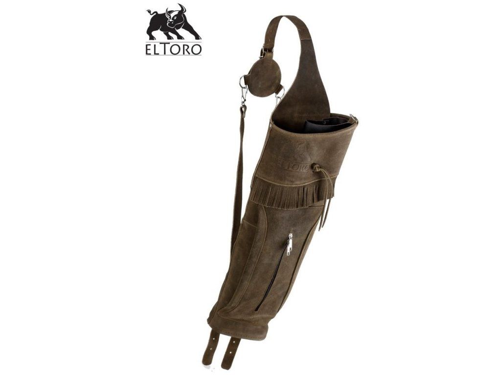 Kožený veľký tulec na chrbát s nastaviteľným remeňom a vreckom na drobnosti na zips, tulec je tmavej farby. Vnútri púzdra je ešte dodatočná priehradka na šípy. Tento tulec je vhodný aj na nosenie ďalšieho príslušenstva, má veľké rozmery, prípadne na nosenie veľkého počtu šípov.