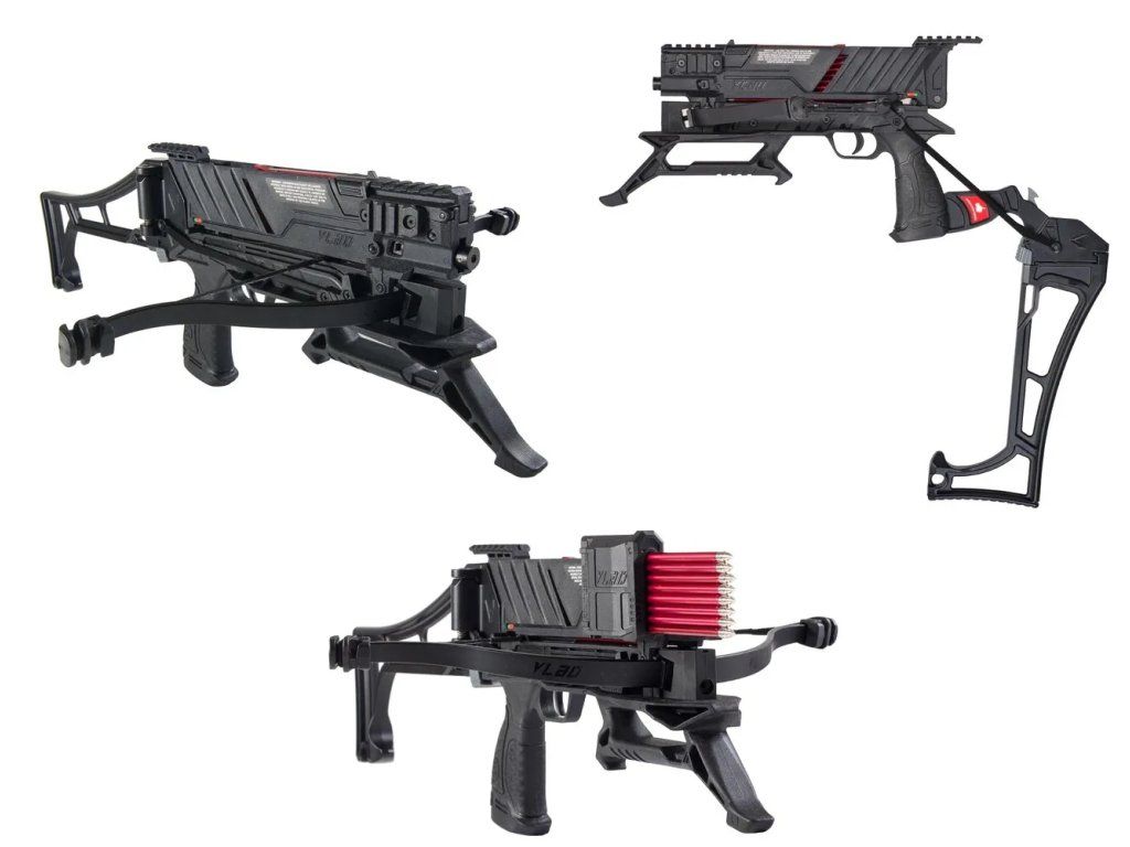 Viacvýstrelová kuša EK Archery VLAD 90 lbs so zásobníkom na 8 šípov. Opakovacia kuša s automatickou poistkou, zásobníkom, ktorý po minutí poslednej šípky nedovolí napnúť tetivu, materiálom kuše je pevné polymérové telo a vzdau zalamovacou pažbou, ktorou sa kuša aj napína. Súčasťou balenia je 60 lbs aj 90 lbs lučište, ľahko vymeniteľné, 16 ks duralových šípiek 6,3´´ dlhých s potrebnou hmotnosťou 11 gramov, ktorá znesie silu 90 lbs lučišťa (bežné šípky 7 gramov to dokáže roztrhnúť), lubrikant, servisný naťahovač tetivy, náhradná tetiva, koncovky na lučište. Kuša má duralový kolimátor aj pevné mieridlá, možno dokúpiť laserový zameriavač do slotu v hlave kuše. Výkonná pištoľová kuša na presnú streľbu do 25 metrov. Veľkou výhodou je aj sklopná pažba do boku, možno tak spraviť zbraň na skryté nosenie a po rozložení presne strieľať.