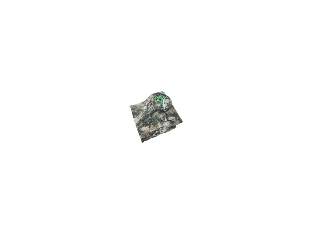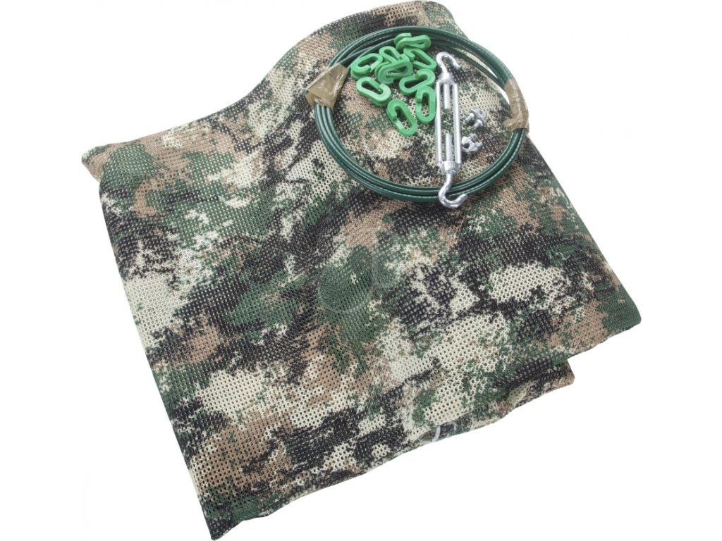 Záchytná sieť s maskáčovým vzorom na zastavenie zblúdilých šípov. Materiál siete je z kevlaru. Zachytí šípy, okrem tenkých karbónových, ťažkých drevených vystrelených z luku 35lbs a viac.´Súčasťou je oceľové lano, šponovadlo a závesné háčky.